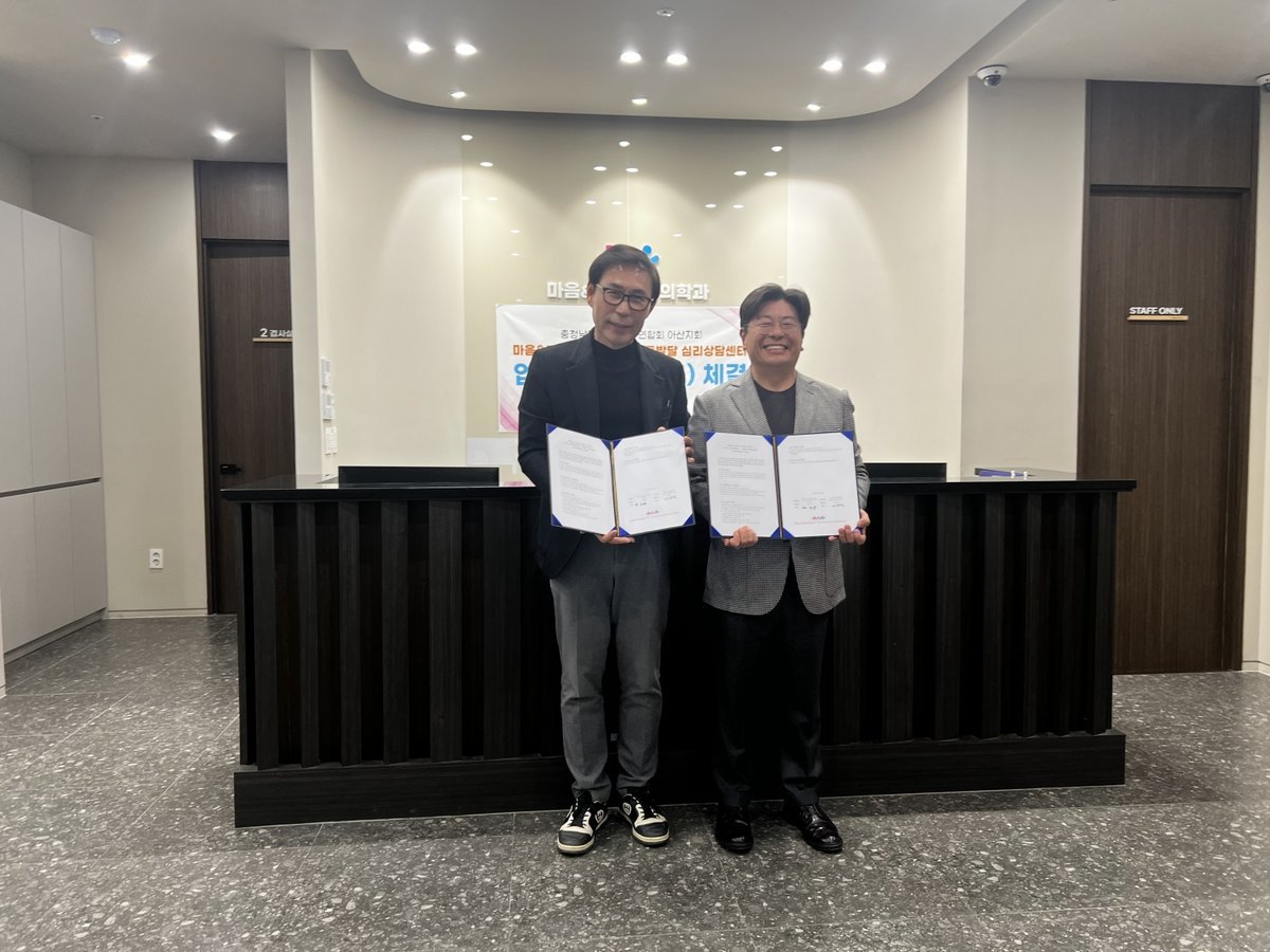 [충청중심뉴스] 충청남도어린이집연합회 아산지회와 마음&정신건강의학과의원 및 아동발달센터는 지난 12일 아산시 탕정면 소재 마음&정신건강의학과에서 지역 내 영유아의 건강한 성장과 조기 발달 지원을 위한 업무협약을 체결했다.