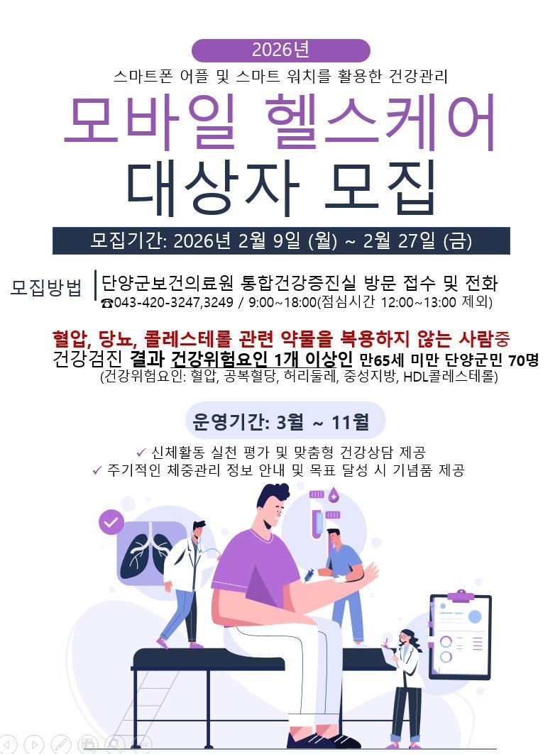 [충청중심뉴스] 단양군은 군민의 만성질환 예방과 건강생활 실천을 지원하기 위해 ‘2026년 모바일 헬스케어 사업’대상자를 오는 27일까지 모집한다.