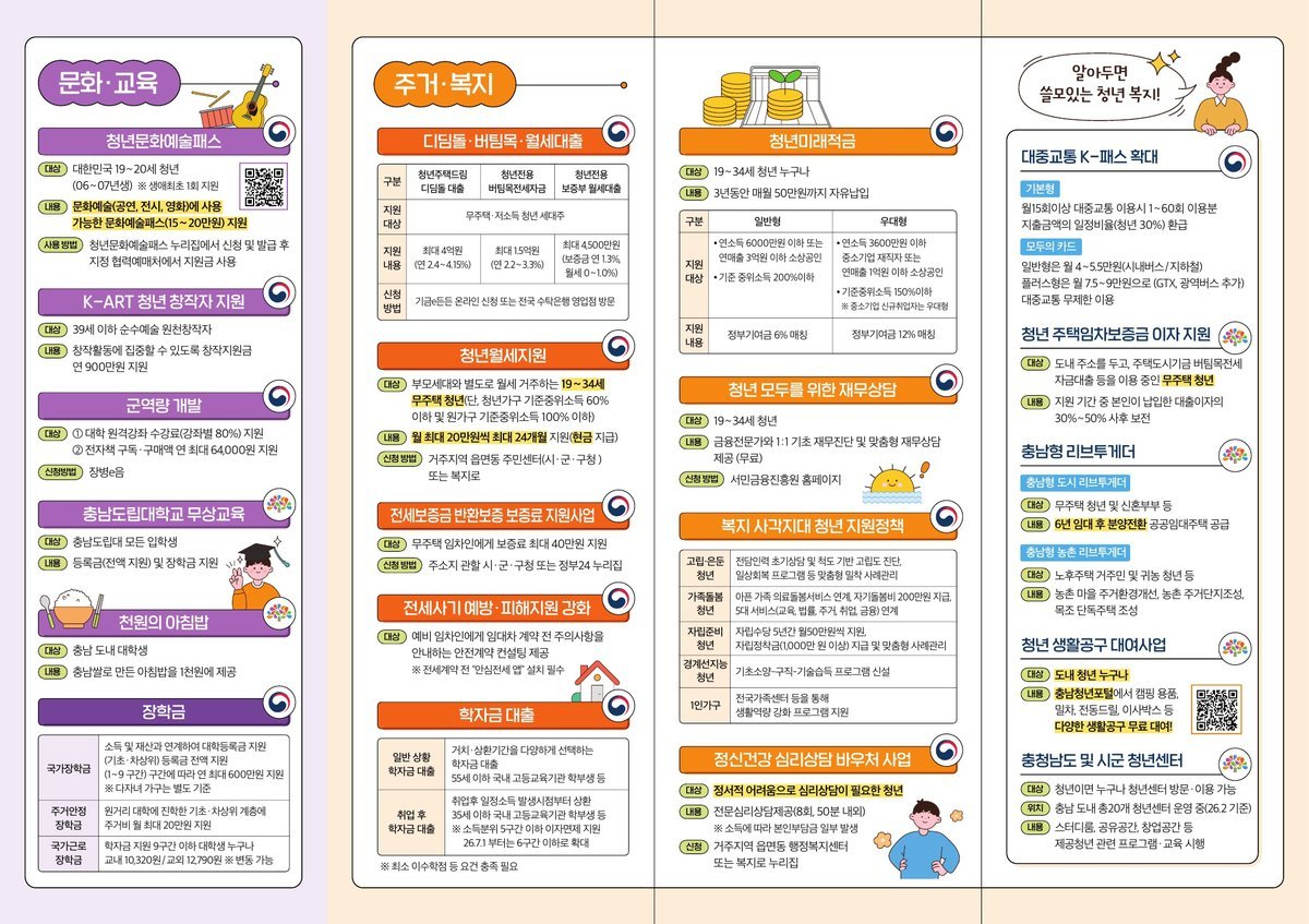 홍보 내용은 △케이-패스 △청년 전용 보증부 월세 대출 △국가기술자격 시험 응시료 지원 △청년문화예술패스 △케이-아트 청년 창작자 지원 △천 원의 아침밥 △충남도립대 무상교육 △일 경험 지원사업 △청년창업사관학교 △충남형 청년인턴 △청년자립형 스마트팜 지원 △공공임대주택 △청년도약계좌 △충남형 도시·농촌 리브투게더 △청년 자살 예방 조기 검진 등 교육·일자리·주거·금융·복지·문화 분야까지 다양하다.