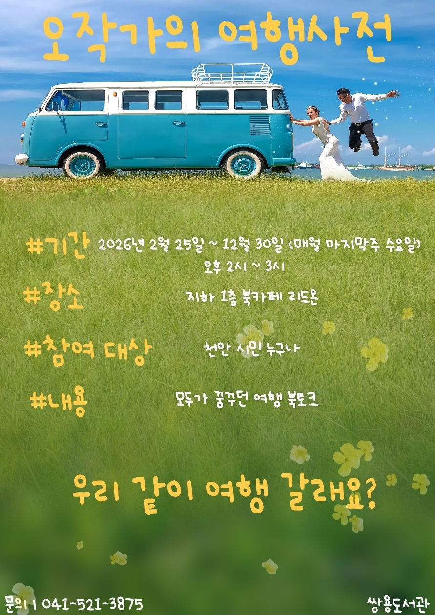 [충청중심뉴스] 천안시 쌍용도서관은 문화가 있는 날을 맞아 여행 강연 프로그램 ‘오작가의 여행 사전’을 운영한다고 19일 밝혔다.