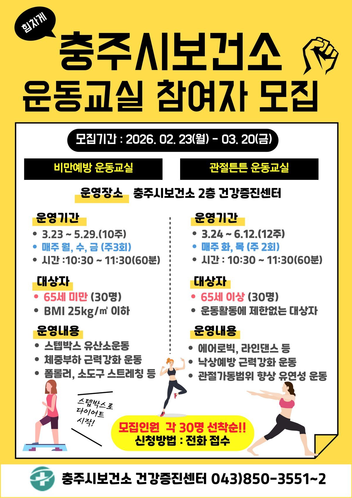 [충청중심뉴스] 충주시 보건소는 시민들의 건강한 생활 습관 형성과 활기찬 일상 회복을 위해 ‘2026년 상반기 운동교실’참여자를 오는 3월 20일까지 모집한다고 23일 밝혔다.