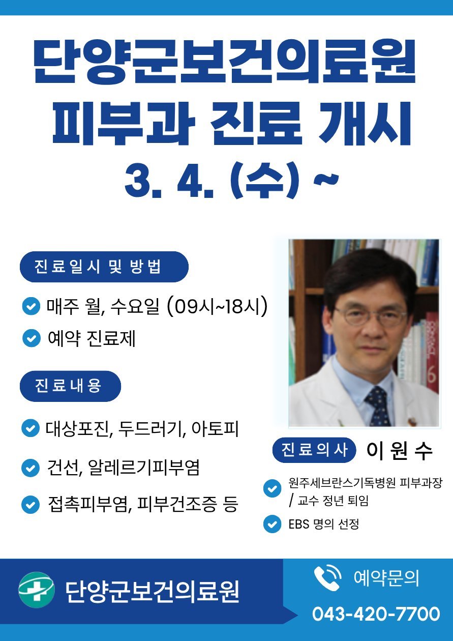 [충청중심뉴스] 단양군보건의료원이 지역 주민의 피부 건강 증진을 위해 피부과 전문 진료실을 개설하고 오는 3월 4일부터 본격적인 진료를 시작한다.
