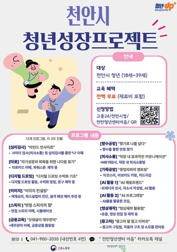 참여 대상은 시에 거주하는 18~ 39세 청년으로 신청은 천안청년센터 이음누리집에서 선착순으로 진행된다.