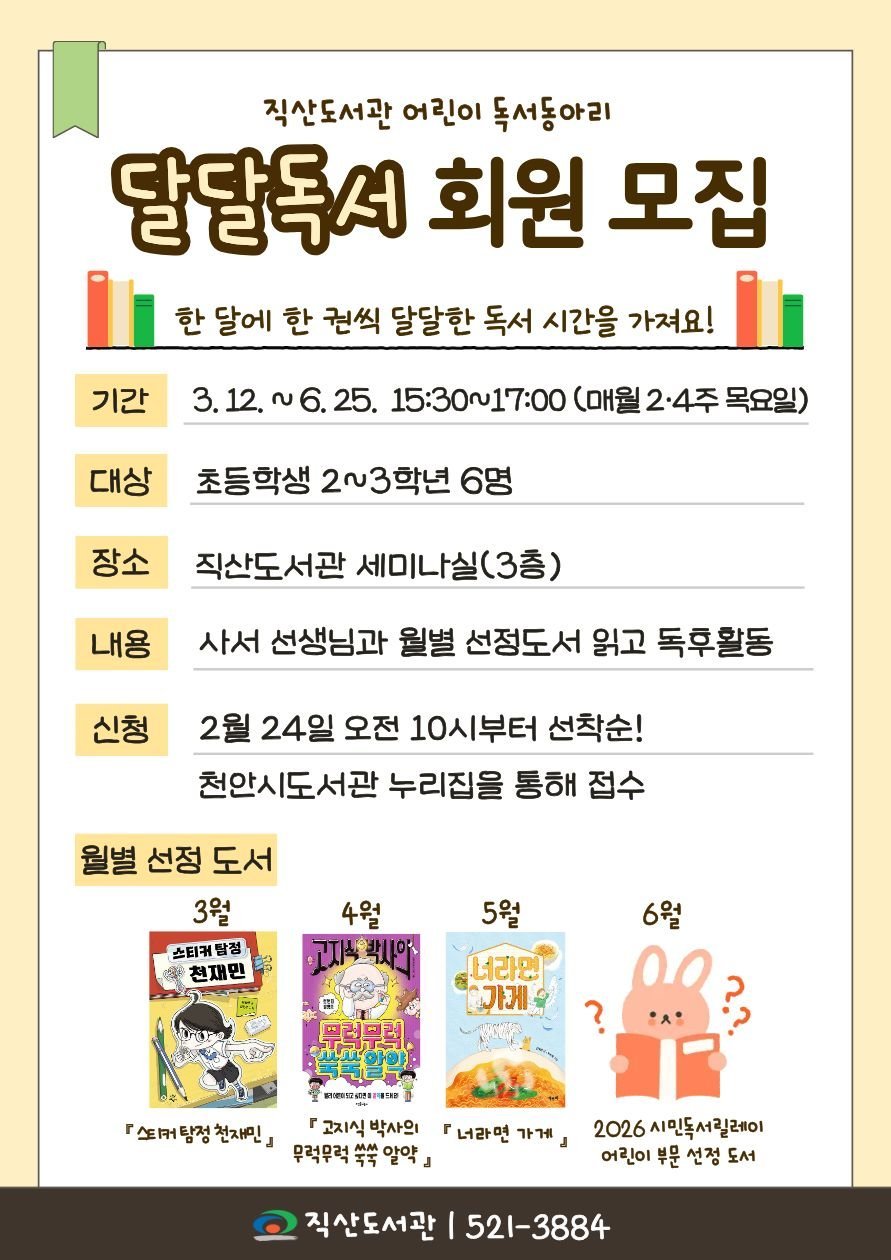 [충청중심뉴스] 천안시 직산도서관은 상반기 어린이 독서동아리 ‘달달독서’참여자를 모집한다고 23일 밝혔다.