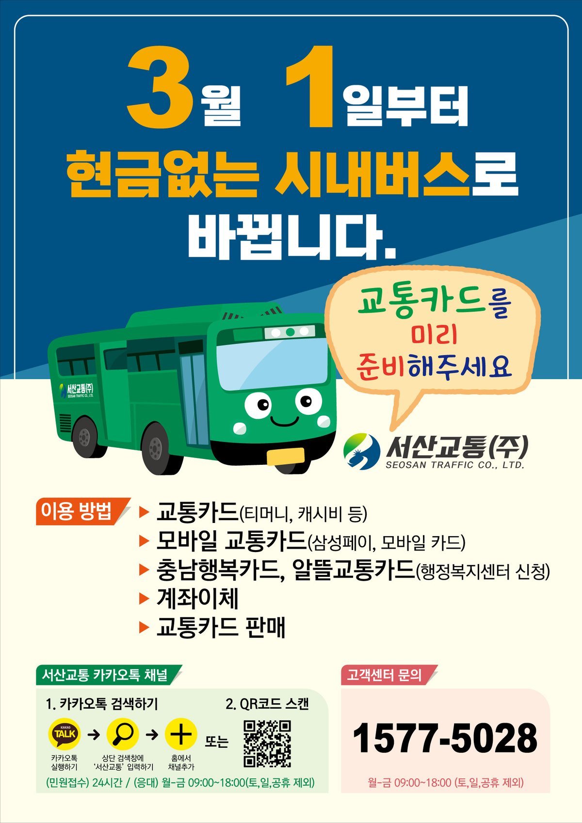 [충청중심뉴스] 충남 서산시는 오는 3월 1일부터 관내 시내버스 모든 노선이 ‘현금 없는 버스’로 운영된다고 밝혔다.