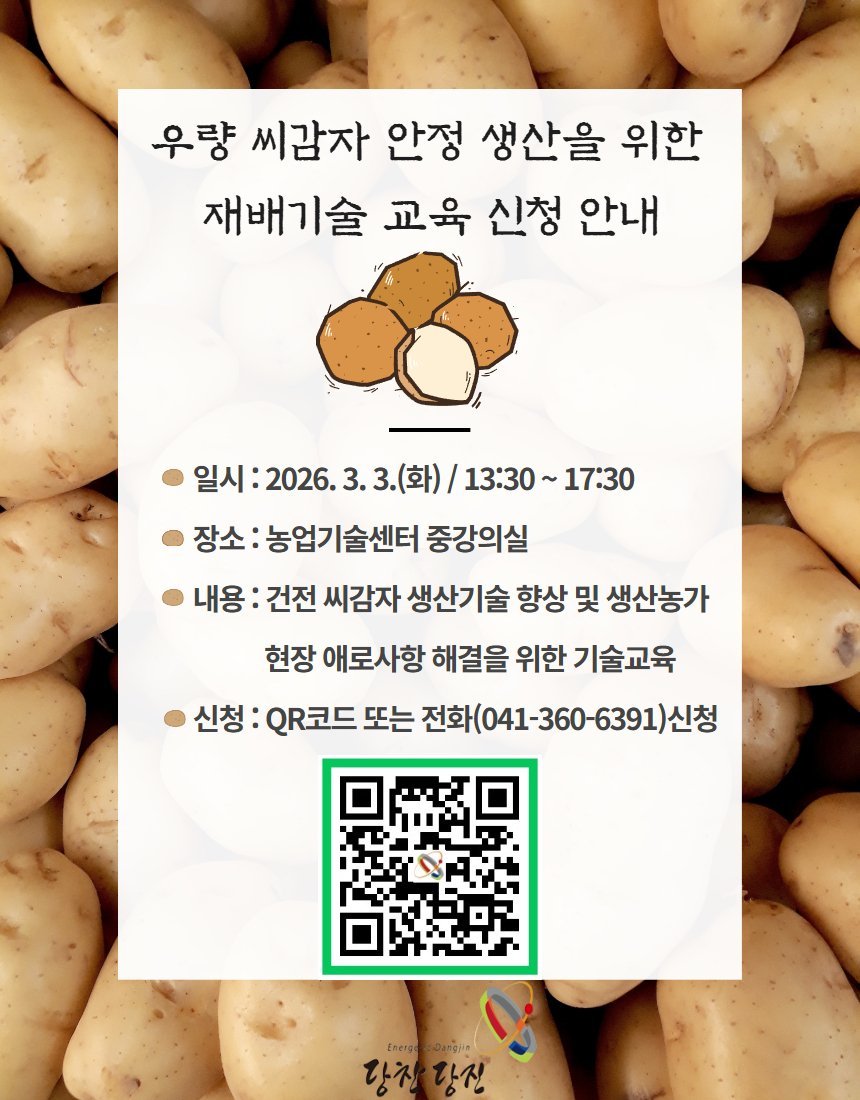 [충청중심뉴스] 당진시는 오는 3월 3일 오후 1시 30분 당진시농업기술센터 중강의실에서 씨감자 추백 재배 농가 및 교육 희망자 50여명을 대상으로 ‘우량 씨감자 안정 생산을 위한 재배기술 교육’을 실시한다고 24일 밝혔다.