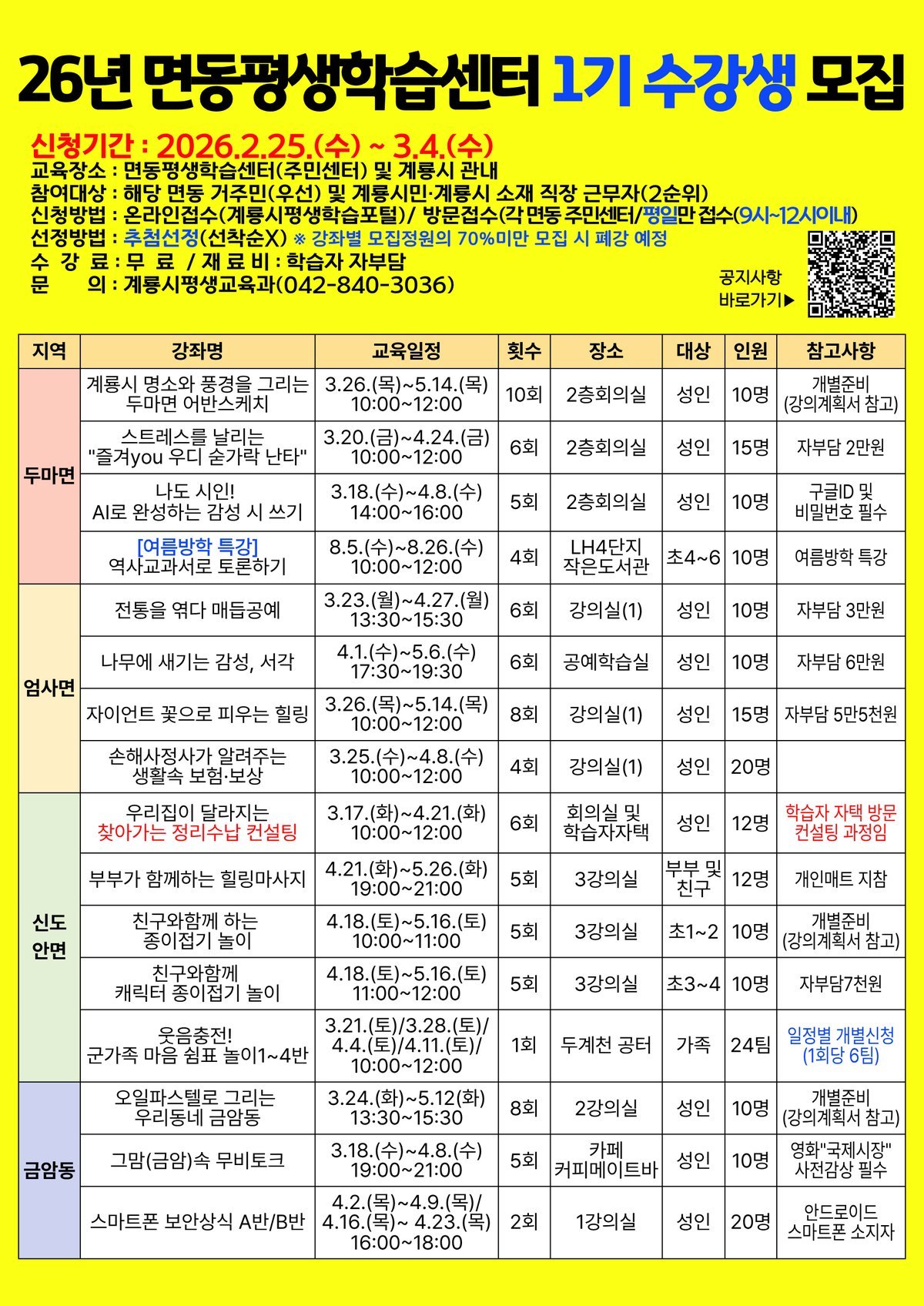[충청중심뉴스] 충남 계룡시는 2월 25일부터 오는 3월 4일까지 2026년 면·동 평생학습센터 주민 맞춤형 평생학습프로그램 1기 수강생을 모집한다고 밝혔다.