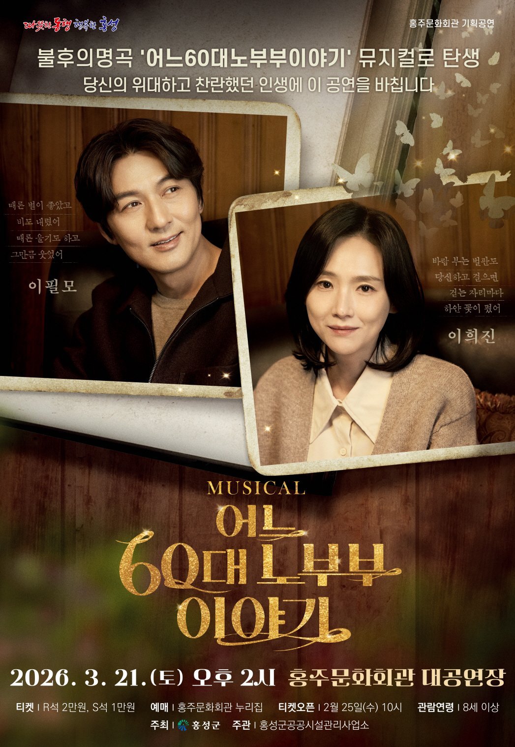 [충청중심뉴스] 홍성군 홍주문화회관은 다음달 21일 오후 2시, 중장년층을 넘어 모든 세대가 공감할 수 있는 따뜻한 가족 이야기를 그려낸 뮤지컬 ‘어느 60대 노부부 이야기’를 무대에 올린다.