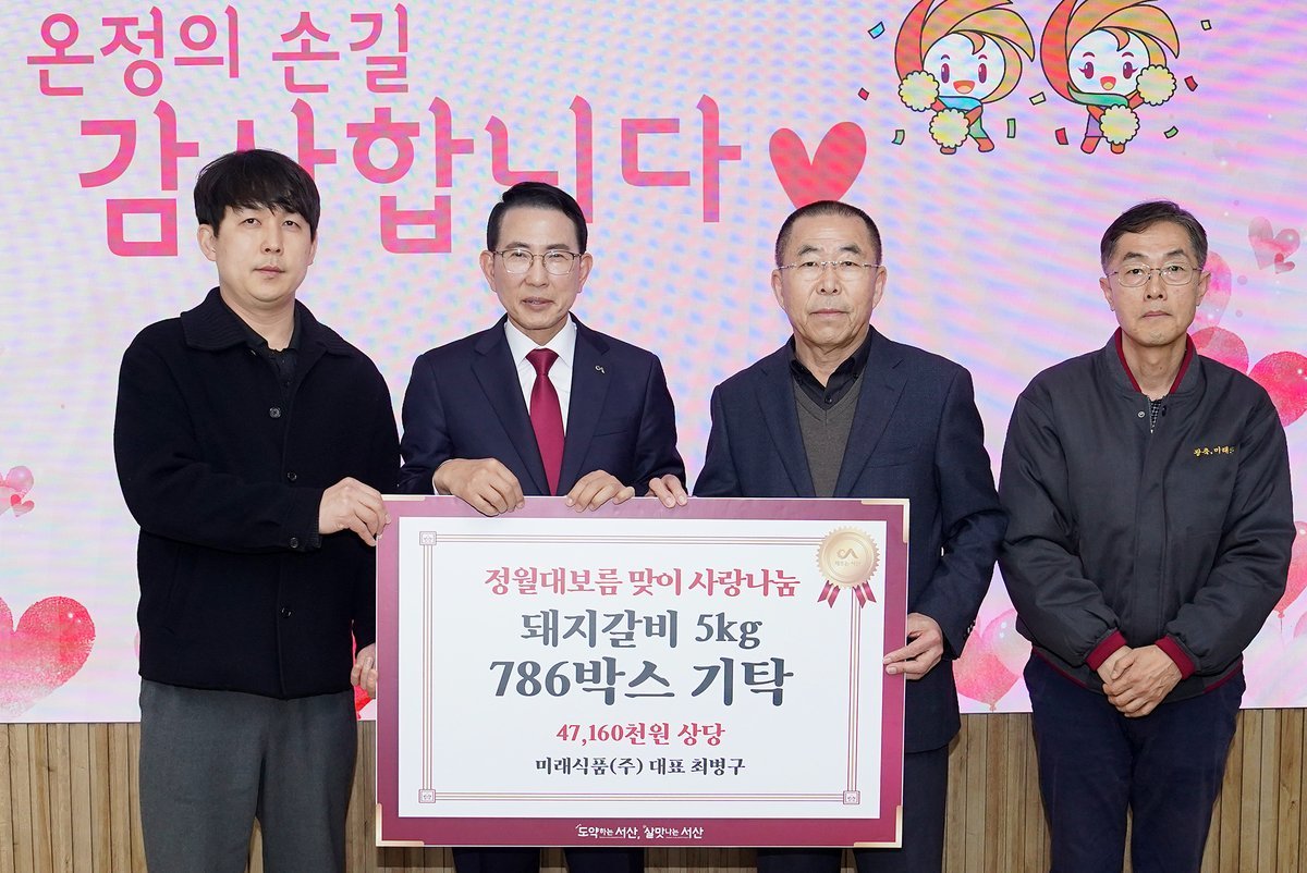 [충청중심뉴스] 충남 서산시는 지난 24일 미래식품㈜에서 정월대보름을 맞아 돼지갈비 786박스를 기탁했다고 밝혔다.