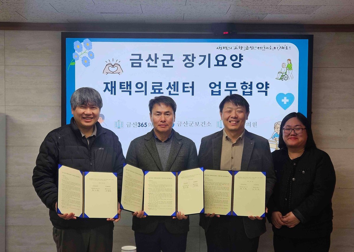 [충청중심뉴스] 금산군보건소는 지난 24일 보건소장실에서 지역 의료기관인 금산365의원, 금산한의원과 장기요양 재택의료센터 시범사업 업무협약을 체결했다.