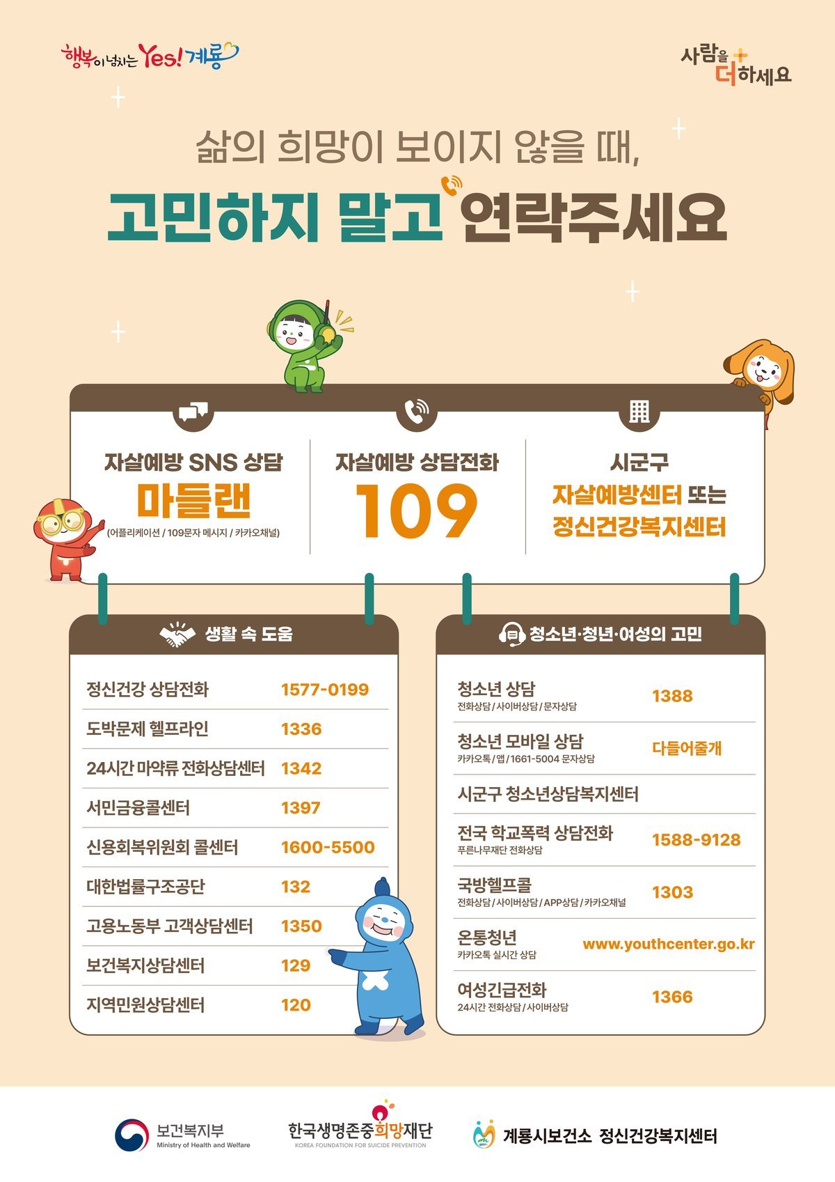이에 계룡시는 △‘자살예방 상담전화 109’홍보 현수막 게시 및 전광판 송출 △관공서 공동주택 등 ‘자살고위험군 지원 정보’포스터 부착 △농협중앙회와 연계한 공동 캠페인 전개 △자살 고위험군 안부 확인 및 모니터링 강화 등 다양한 활동을 추진할 계획이다.