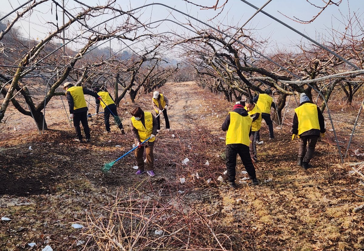 올해 사업은 지난 7일 새마을꽃마실봉사단 12명이 심천면 금정리에서 복숭아 나무 가지 줍기 및 전지 작업을 지원하며 시작됐다.