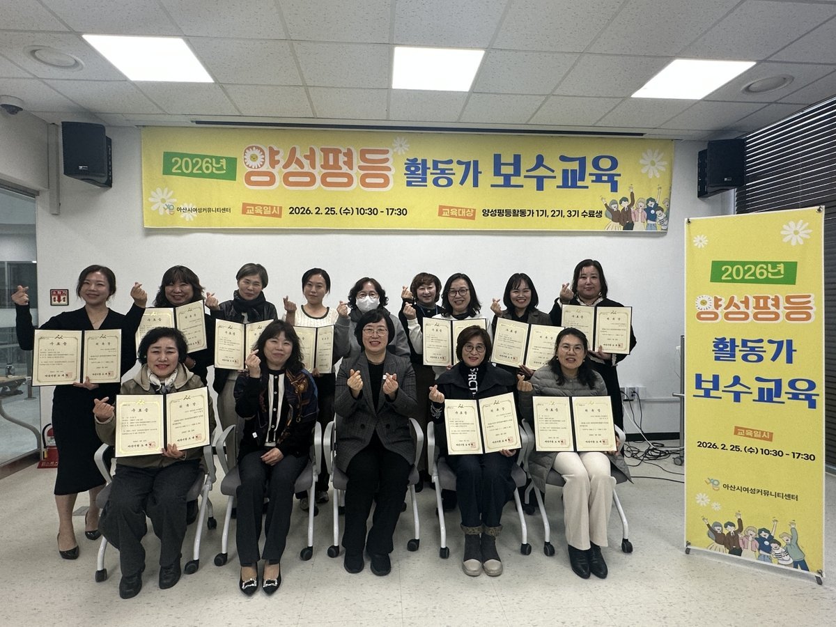 [충청중심뉴스] 아산시 여성커뮤니티센터 나온 은 지난 25일 센터 교육장에서 아산시 양성평등 리더 활동가 1, 2, 3기 수료생 11명을 대상으로 2026년 아산시 양성평등 리더 활동가 보수교육 을 실시했다.