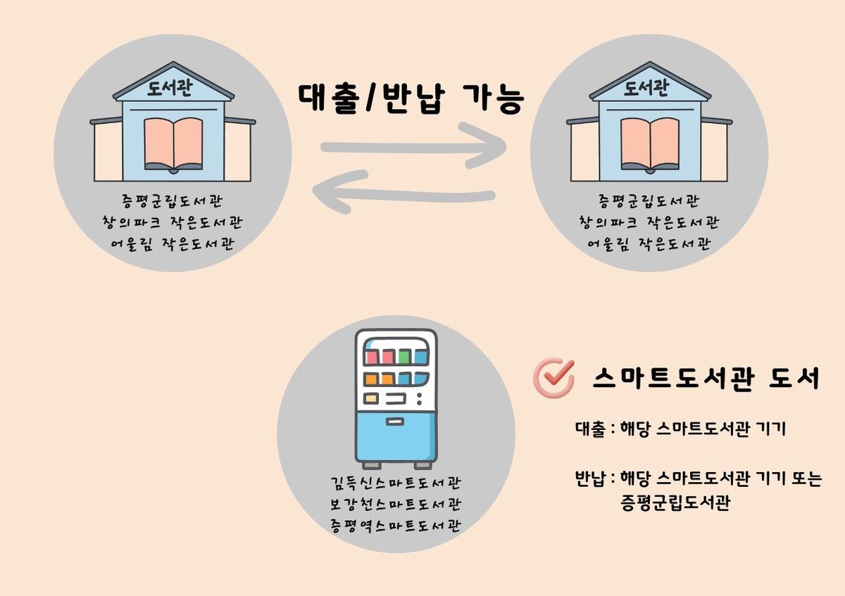 다만 스마트도서관 3곳의 경우 무인 운영 시스템 특성상 해당 스마트도서관에서 대출한 도서는 해당 스마트도서관 또는 증평군립도서관에서만 반납이 가능하다.