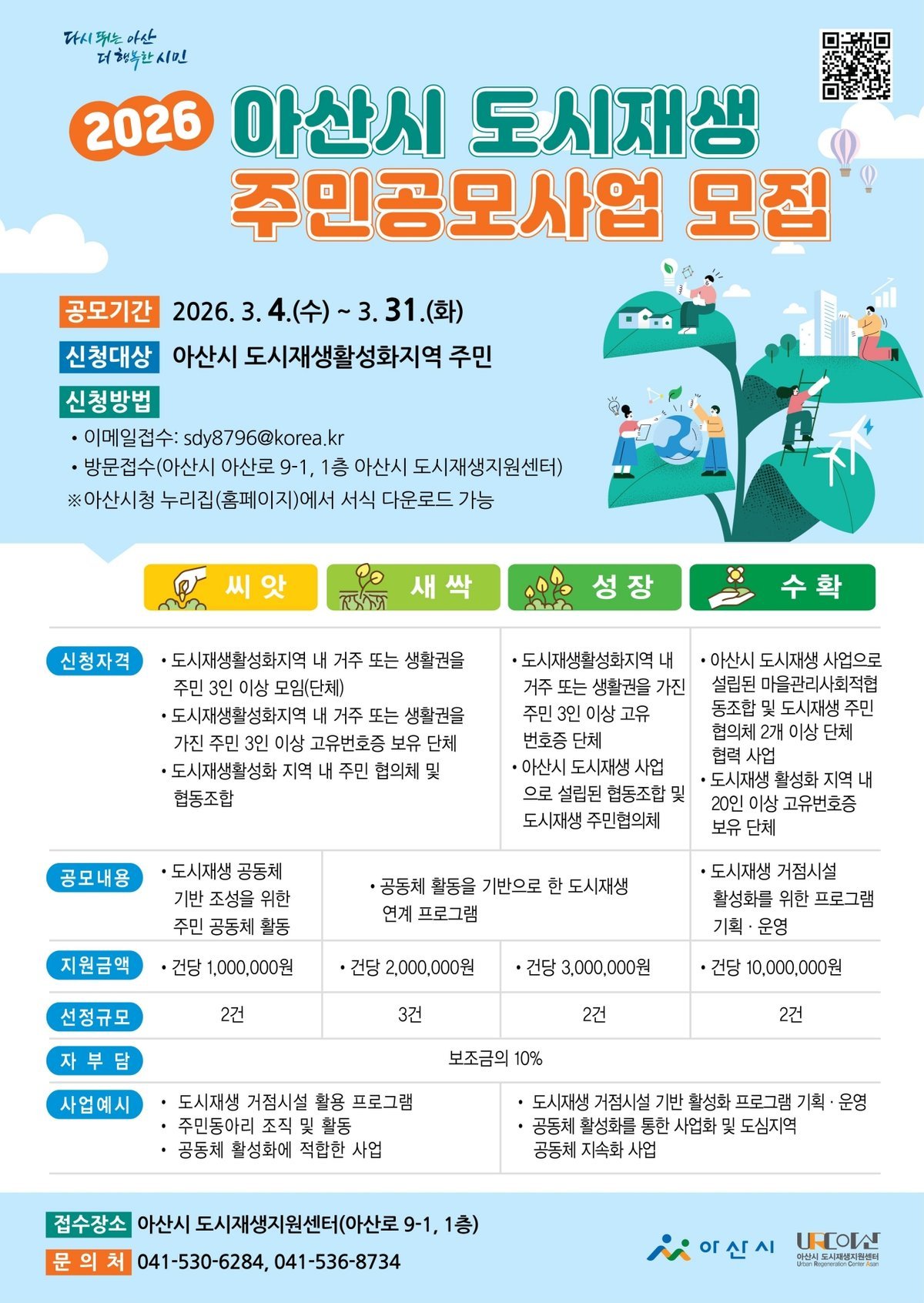 [충청중심뉴스] 아산시는 주민 주도의 지역 활성화 기반을 확대하기 위해 2026년 아산시 도시재생 주민공모사업 신청을 오는 3월 4일부터 3월 31일까지 접수한다고 밝혔다.
