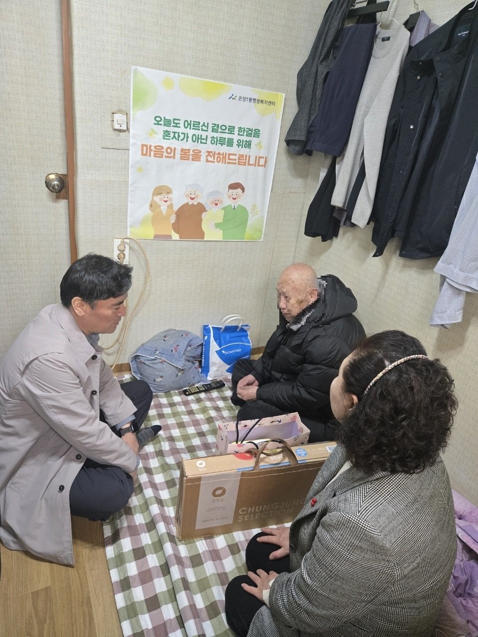[충청중심뉴스] 아산시 온양1동 행정복지센터는 25일과 27일 온천1통 온천2통 최고령 독거 어르신을 찾아 안부를 묻고 건강을 살피는 복지통장 특화사업 '마음의 봄을 나누어 드립니다'를 진행했다.