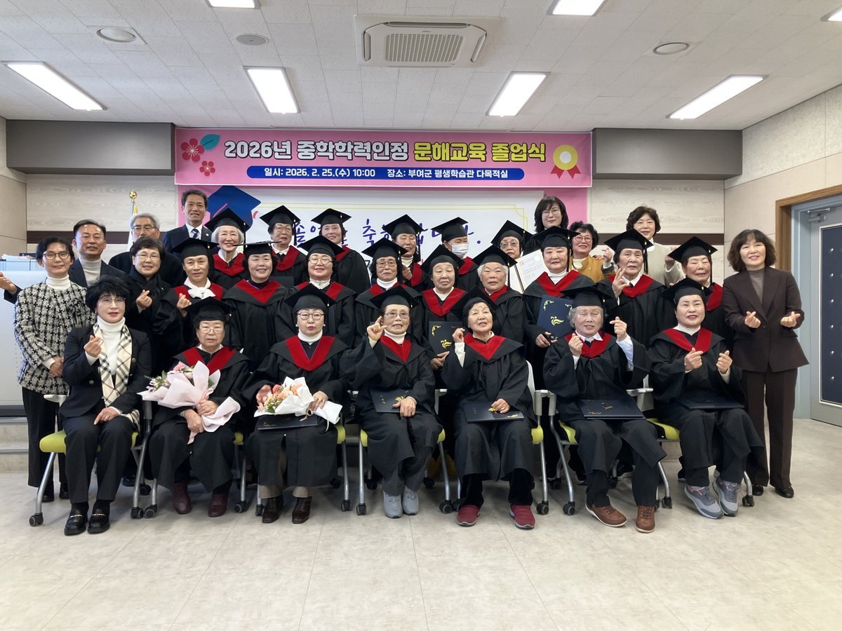[충청중심뉴스] 부여군은 부여군 평생학습관 3층 다목적실에서 ‘2026년 중학학력인정 문해교육 졸업식’을 개최하고 배움의 열정으로 가득 찼던 3년간의 과정을 마친 25명의 어르신에게 졸업장을 수여했다고 4일 밝혔다.