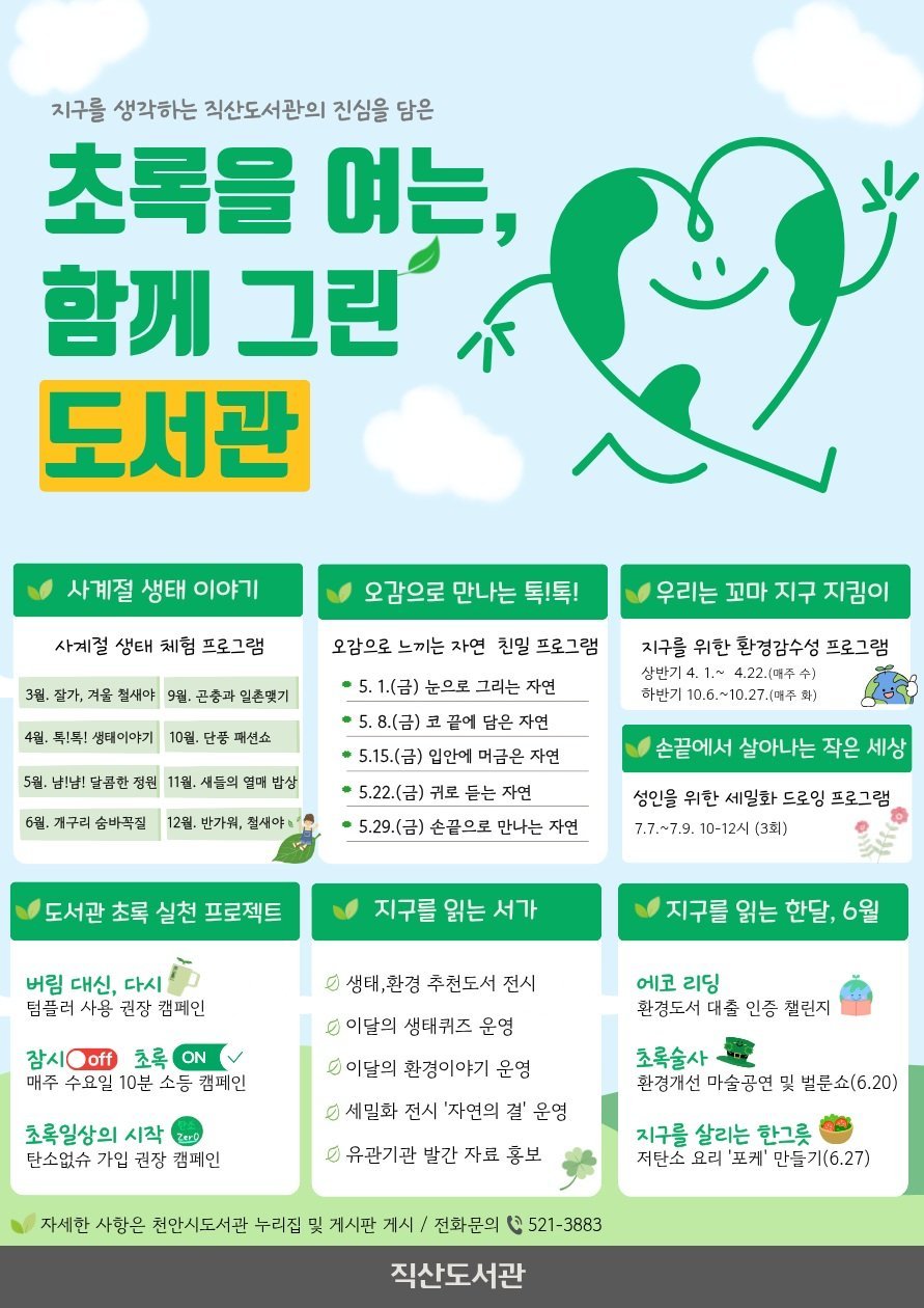 [충청중심뉴스] 천안시 직산도서관이 올해 생태와 환경을 주제로 ‘초록을 여는, 함께 GREEN 도서관’을 운영한다고 4일 밝혔다.