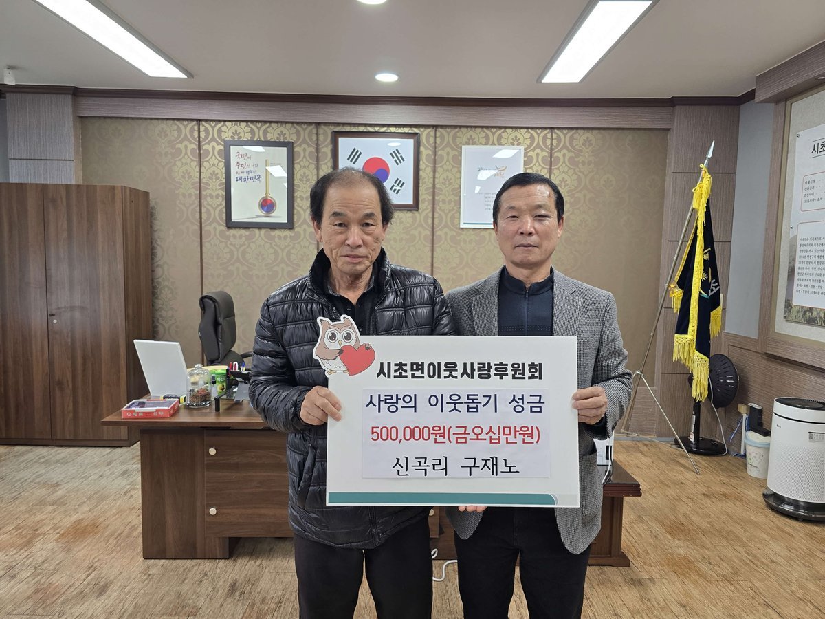 [충청중심뉴스] 서천군 시초면 신곡리에 거주하는 구재노 씨가 어려운 이웃을 위해 써달라며 성금 50만원을 시초면이웃사랑후원회에 기탁했다.