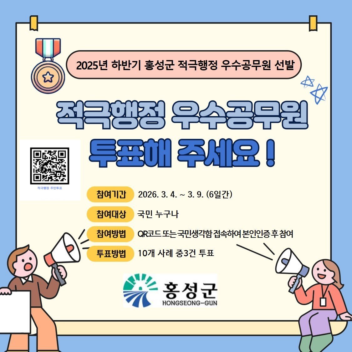 [충청중심뉴스] 홍성군이 ‘2025년 하반기 적극행정 우수공무원 선발’을 위해 오는 9일까지 국민권익위원회 ‘국민생각함’플랫폼에서 온라인 주민 투표를 진행한다.
