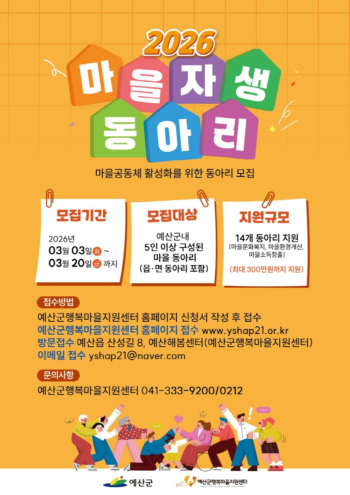 [충청중심뉴스] 예산군행복마을지원센터는 마을에 활력을 불어넣고 마을공동체 회복을 도모하기 위해 2026년 마을자생동아리를 3월 20일까지 모집한다고 밝혔다.