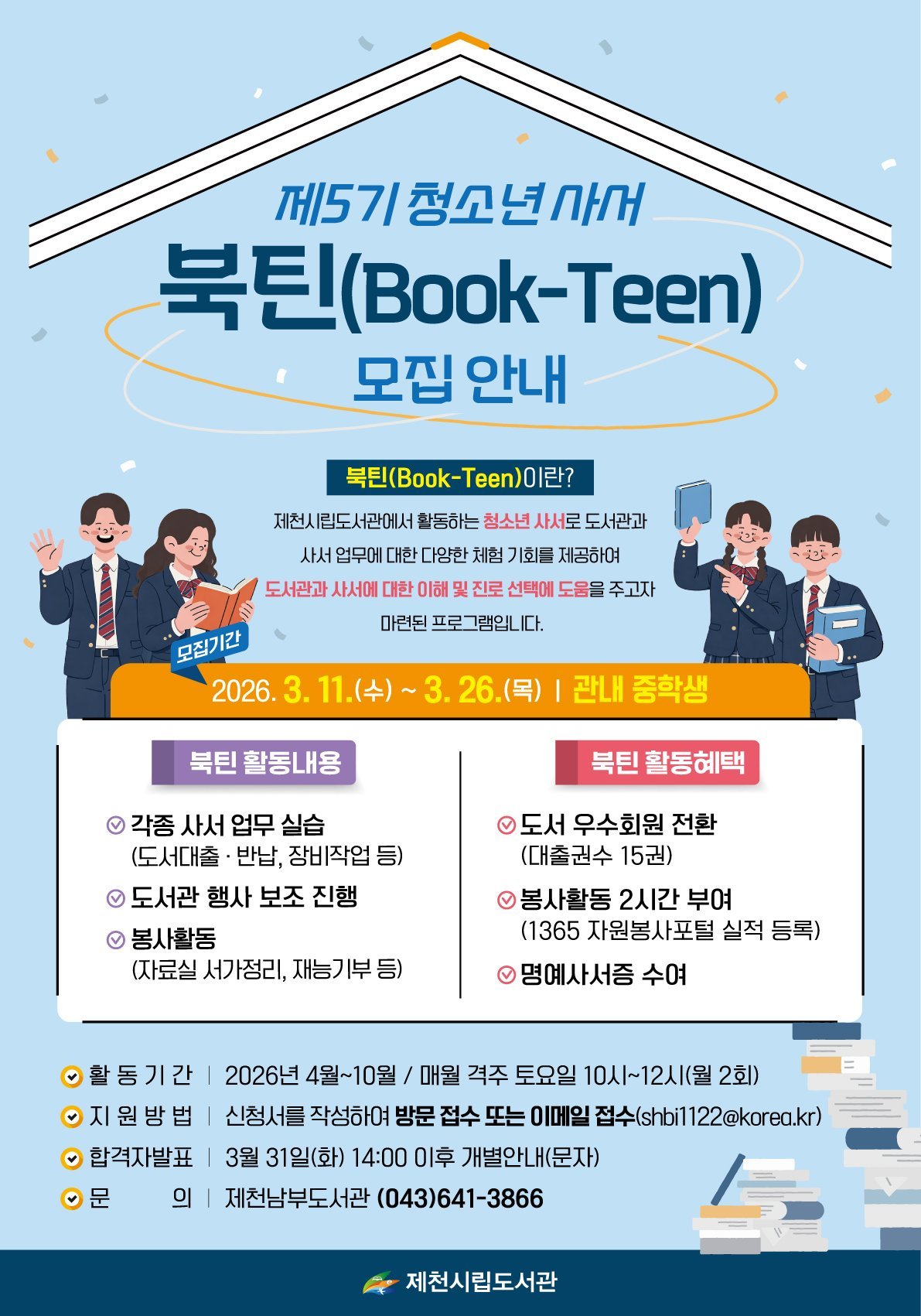 [충청중심뉴스] 제천시립도서관은 2026년 제5기 청소년 사서 ‘북틴’을 모집한다.