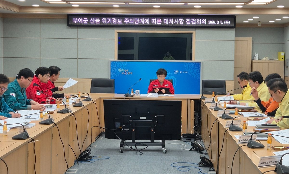 [충청중심뉴스] 충남 부여군은 산불 위기경보 ‘주의’단계에 따른 대응 태세를 강화하기 위해 지난 5일 홍은아 부군수 주재로 안전총괄과, 산림녹지과 등 관계 부서와 부여소방서 대응총괄팀 등 18명이 참석한 가운데 ‘산불 화재 대처 사항 점검 회의’를 개최했다고 밝혔다.