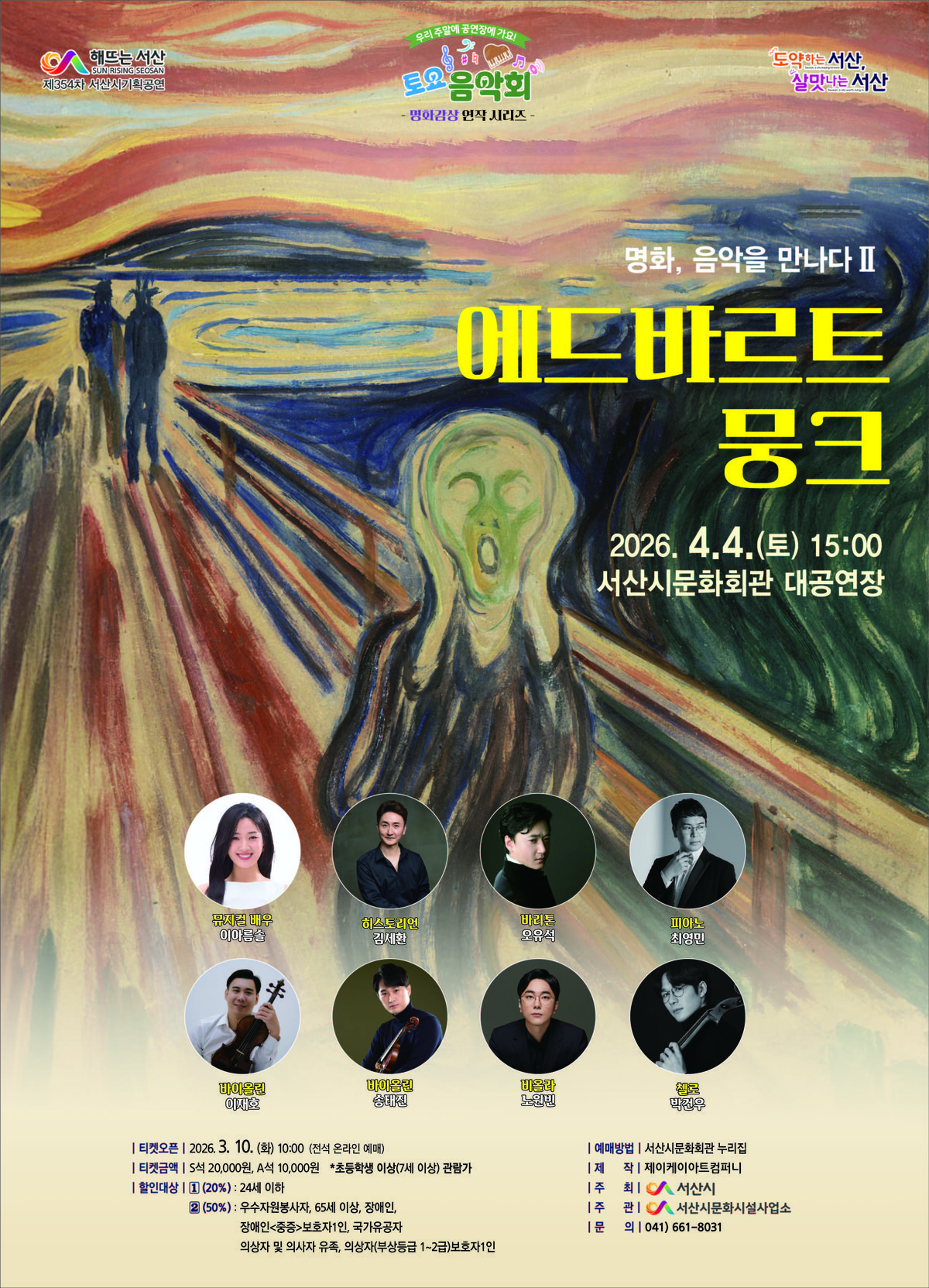 이번 공연은 서산시가 올해 특별기획으로 선보이는 '토요음악회 명화감상 연작 시리즈'의 두 번째 작품으로 지난 3월 앙리 마티스 편에 이어 세계적인 표현주의 화가 에드바르트 뭉크의 예술 세계를 음악과 영상으로 재해석한 무대다.