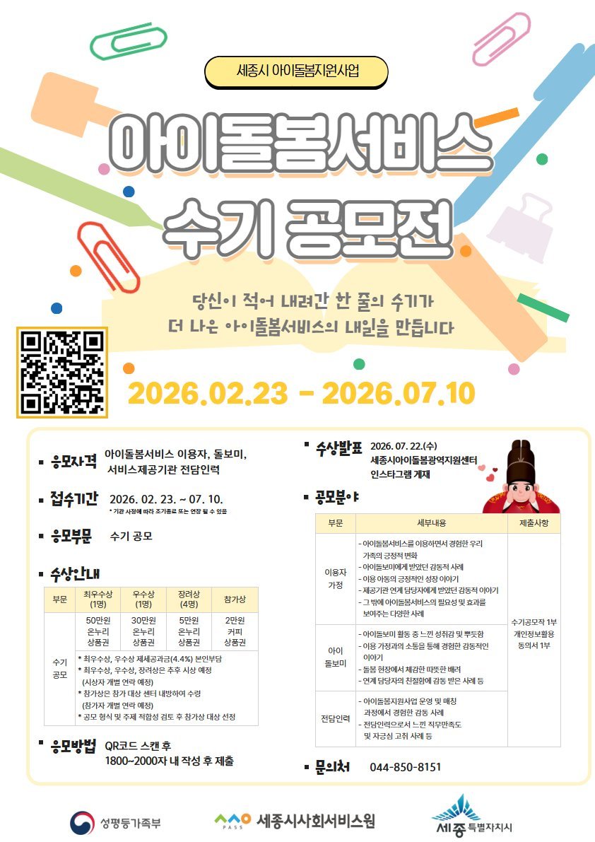 김지현 세종시아이돌봄광역지원센터장은 “이번 수기 공모전이 아이돌봄서비스를 통해 경험한 일상의 변화와 감동을 나누는 계기가 되길 바란다”며 “수기에 담긴 현장의 목소리를 적극 반영해 세종시 아이돌봄 서비스가 더욱 신뢰받는 서비스로 발전할 수 있도록 노력하겠다”고 말했다.