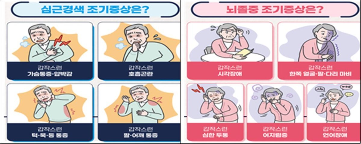 심근경색의 경우 갑작스러운 가슴 통증과 압박감, 호흡곤란, 턱 목 등 발 어깨 등으로 퍼지는 통증이 대표적인 조기 증상이며 뇌졸중은 갑작스러운 시각장애와 편마비, 심한 두통, 어지럼증 등이 주요 증상으로 알려져 있다.