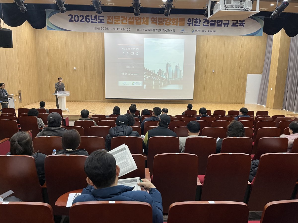[충청중심뉴스] 세종시가 지난 10일 조치원 복합커뮤니티센터에서 대한전문건설협회 세종시 충남도회 회원사 및 관계자를 대상으로 건설법규 교육을 진행했다.