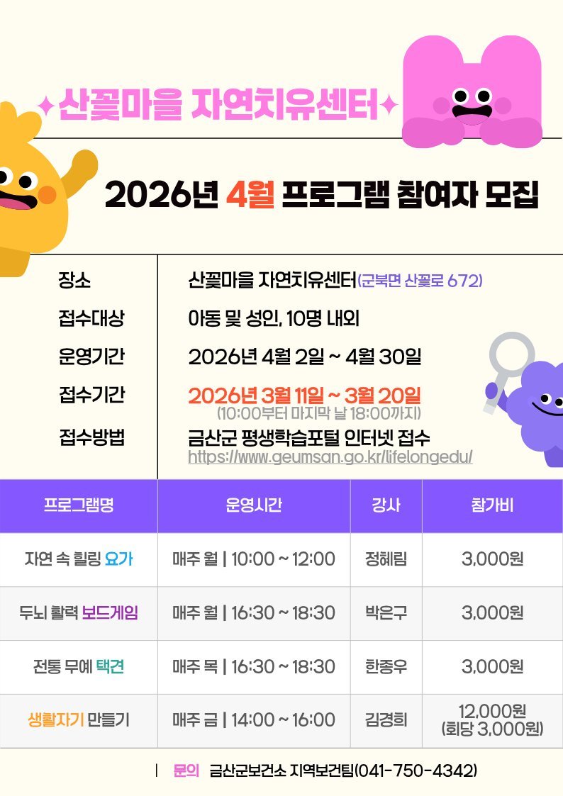 [충청중심뉴스] 금산군은 지역 주민의 건강 증진과 여가 활성화를 위해 3월 11일부터 20일까지 산꽃마을 자연치유센터 2026년 4월 프로그램 참여자를 프로그램별로 8명에서 12명까지 모집한다.