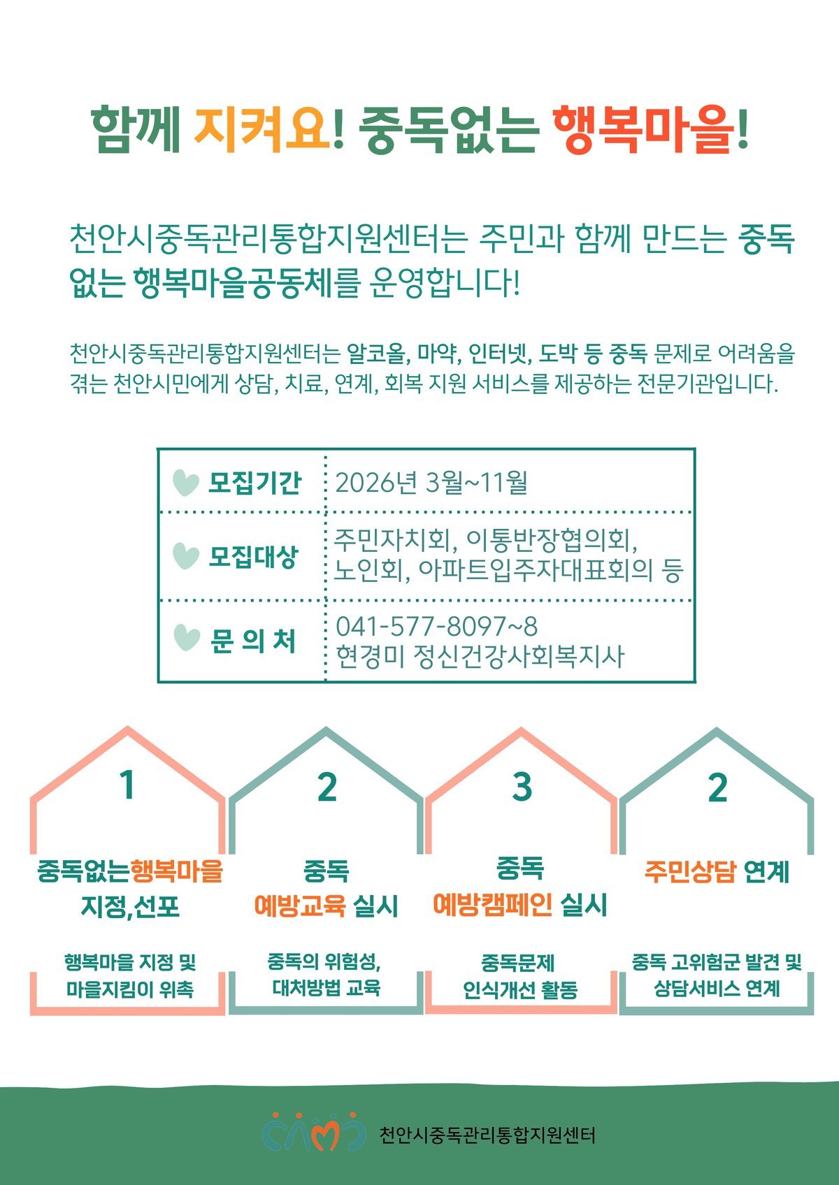 [충청중심뉴스] 천안시중독관리통합지원센터는 올해 ‘함께 지켜요 중독없는 행복마을’사업을 확대 추진한다고 11일 밝혔다.
