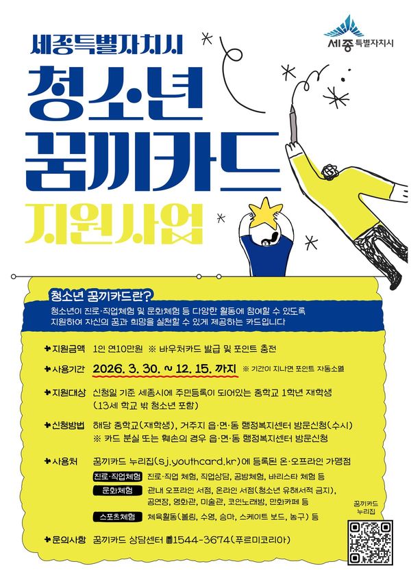 [충청중심뉴스] 지원 대상은 세종시에 주소를 둔 2013년생 청소년이며 1인당 지원액은 연간 10만원이다.
