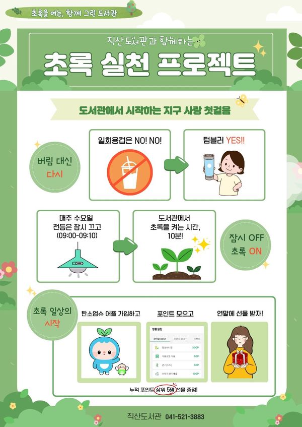 [충청중심뉴스] 천안시 직산도서관이 일상 속 탄소중립 실천 문화를 확산하기 위해 시민들과 함께하는 연중 환경 보호 캠페인 ‘초록 실천 프로젝트’를 운영한다고 13일 밝혔다.