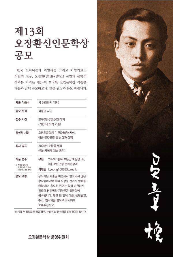[충청중심뉴스] 충북 보은군과 오장환 문학상 운영위원회는 한국 모더니즘과 리얼리즘, 아방가르드 시단의 선구자로 평가받는 오장환 시인의 문학 정신을 기리고 유망한 신인 시인을 발굴하기 위해 ‘제13회 오장환 신인문학상’작품을 공모한다.
