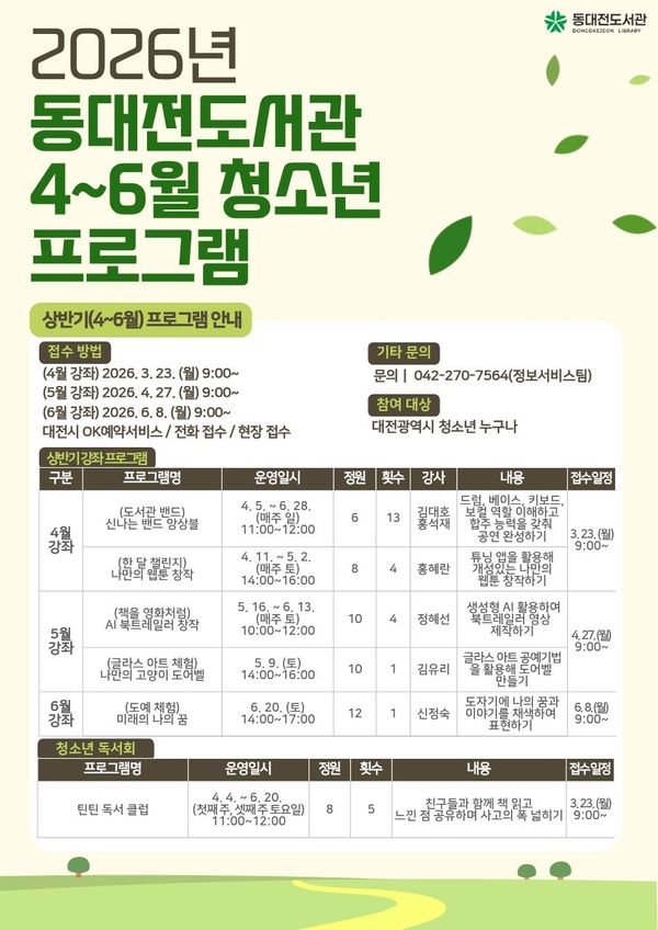 [충청중심뉴스] 동대전도서관은 봄을 맞아 오는 4월 5일부터 6월 20일까지 청소년을 대상으로 다양한 독서 문화 프로그램을 운영한다.