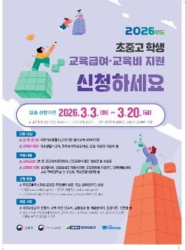 [충청중심뉴스] 아산시는 저소득 가구 학생의 교육기회 보장을 위해 2026년 교육급여 및 초 중 고 교육비 지원사업 집중 신청기간을 3월 3일부터 3월 20일까지 운영한다.