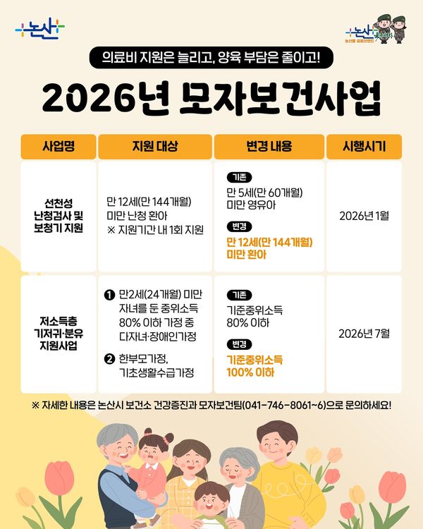 시 관계자는 “임신과 출산, 양육 과정에서 실질적인 도움이 될 수 있도록 지원 범위를 확대했다”며 “앞으로도 시민이 체감할 수 있는 다양한 모자보건 정책을 통해 아이와 부모 모두가 행복한 지역 환경을 만들어 가겠다”고 말했다 자세한 사항은 논산시보건소 건강증진과 모자보건팀으로 문의하면 된다.