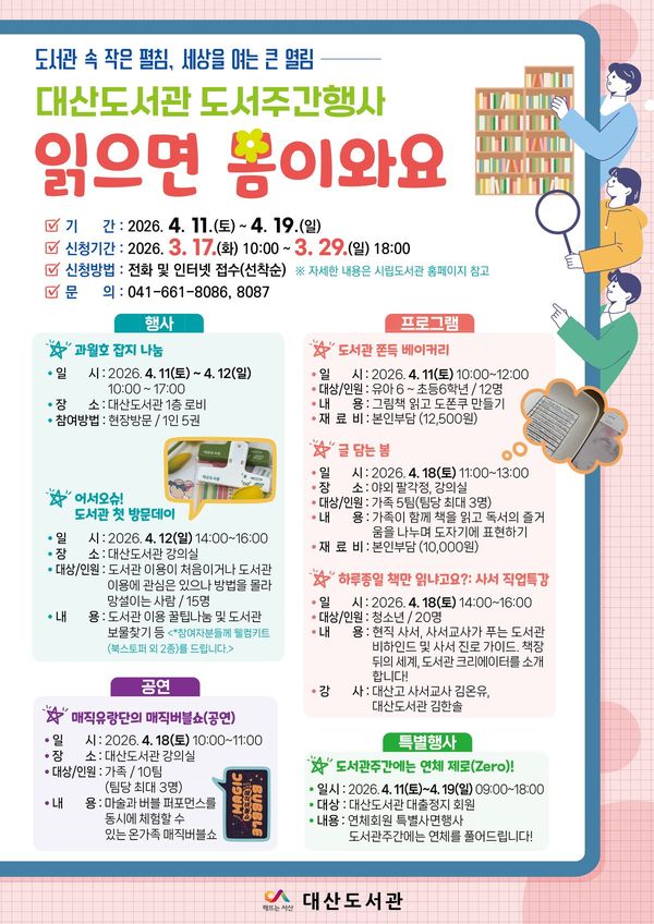 [충청중심뉴스] 서산시는 지역 주민의 도서관 이용을 활성화하고 도서관의 역할을 알리기 위해 오는 3월 17일부터 3월 29일까지 2026년 도서관주간 행사 읽으면 봄이 와요 수강생을 모집한다.