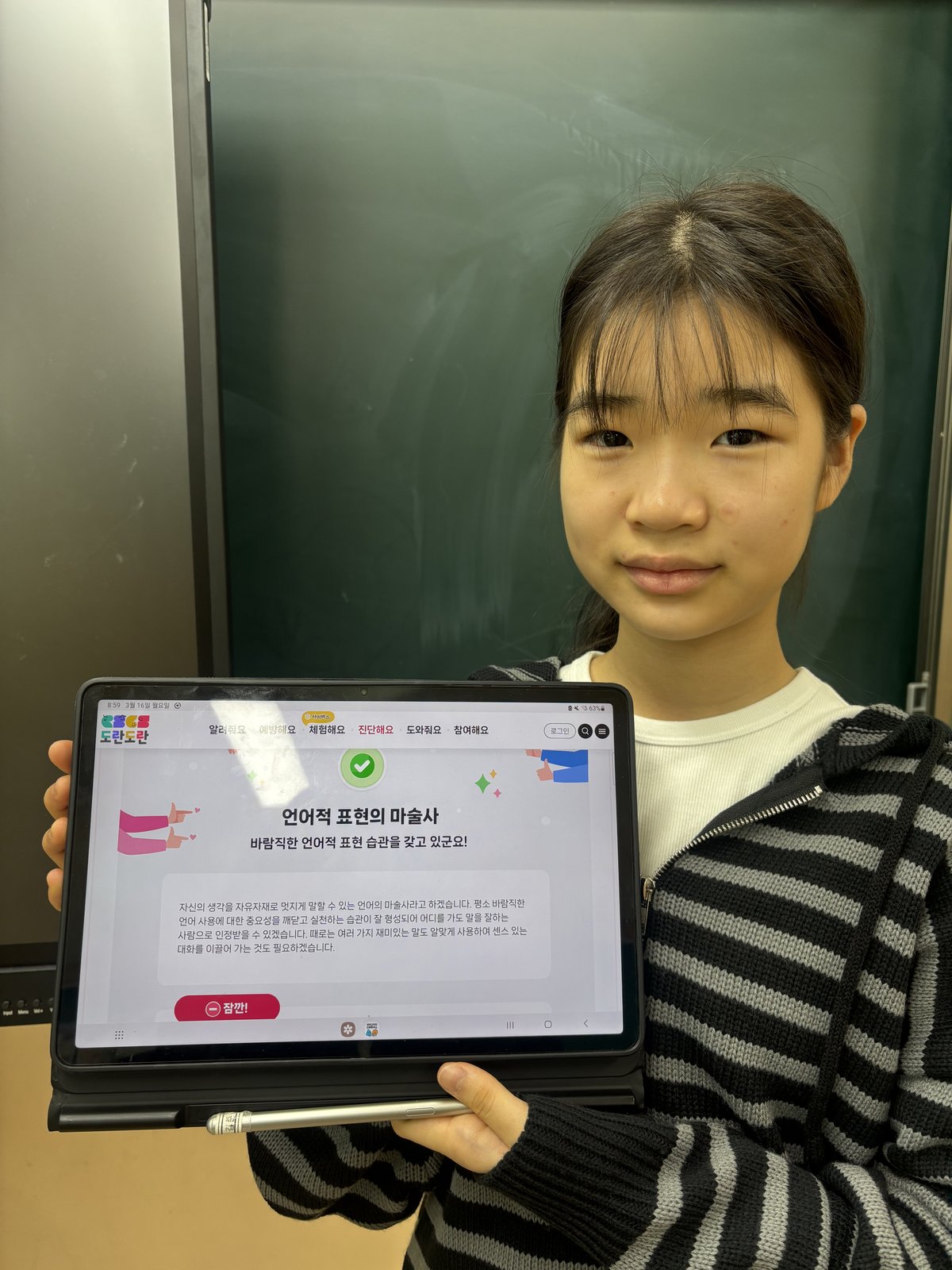 자기진단에 참여한 김준 학생은“평소 친구들과 이야기할 때 무심코 사용하는 말이 다른 사람에게 상처가 될 수 있다는 점을 생각해 보게 됐다”며“앞으로 친구들과 서로 존중하는 말을 쓰려고 노력하겠다”고 말했다.