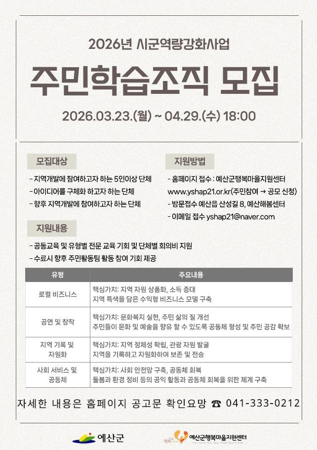 [충청중심뉴스] 예산군행복마을지원센터는 지역개발에 대한 주민 공감을 이끌어내고 실질적인 지역 현안 해결 아이디어를 구체화하기 위해 ‘2026년 주민학습조직’참여단체를 4월 29일까지 모집한다고 밝혔다.