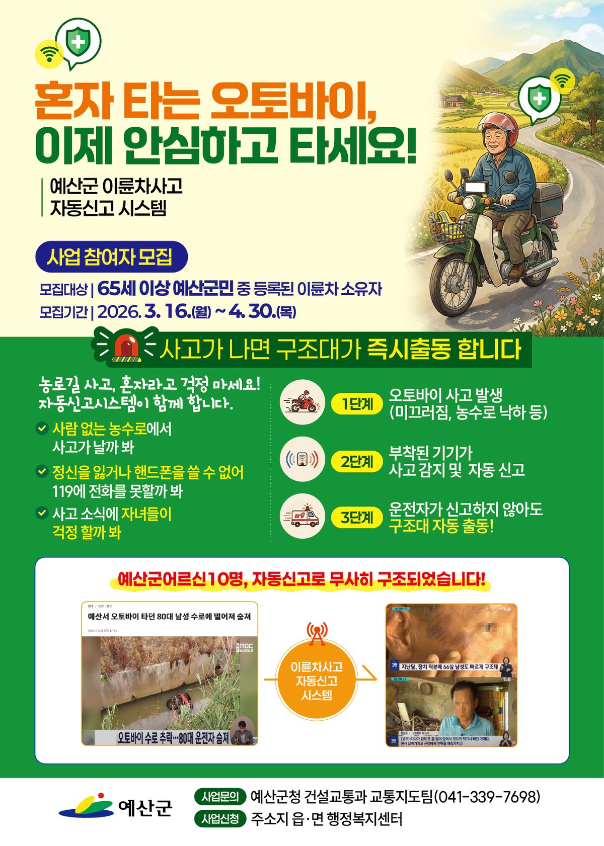[충청중심뉴스] 예산군은 이륜차사고 발생 시 자동 신고를 통해 신속한 구조를 지원하는 ‘이륜차사고 자동신고 시스템 운영’사업을 추진한다.