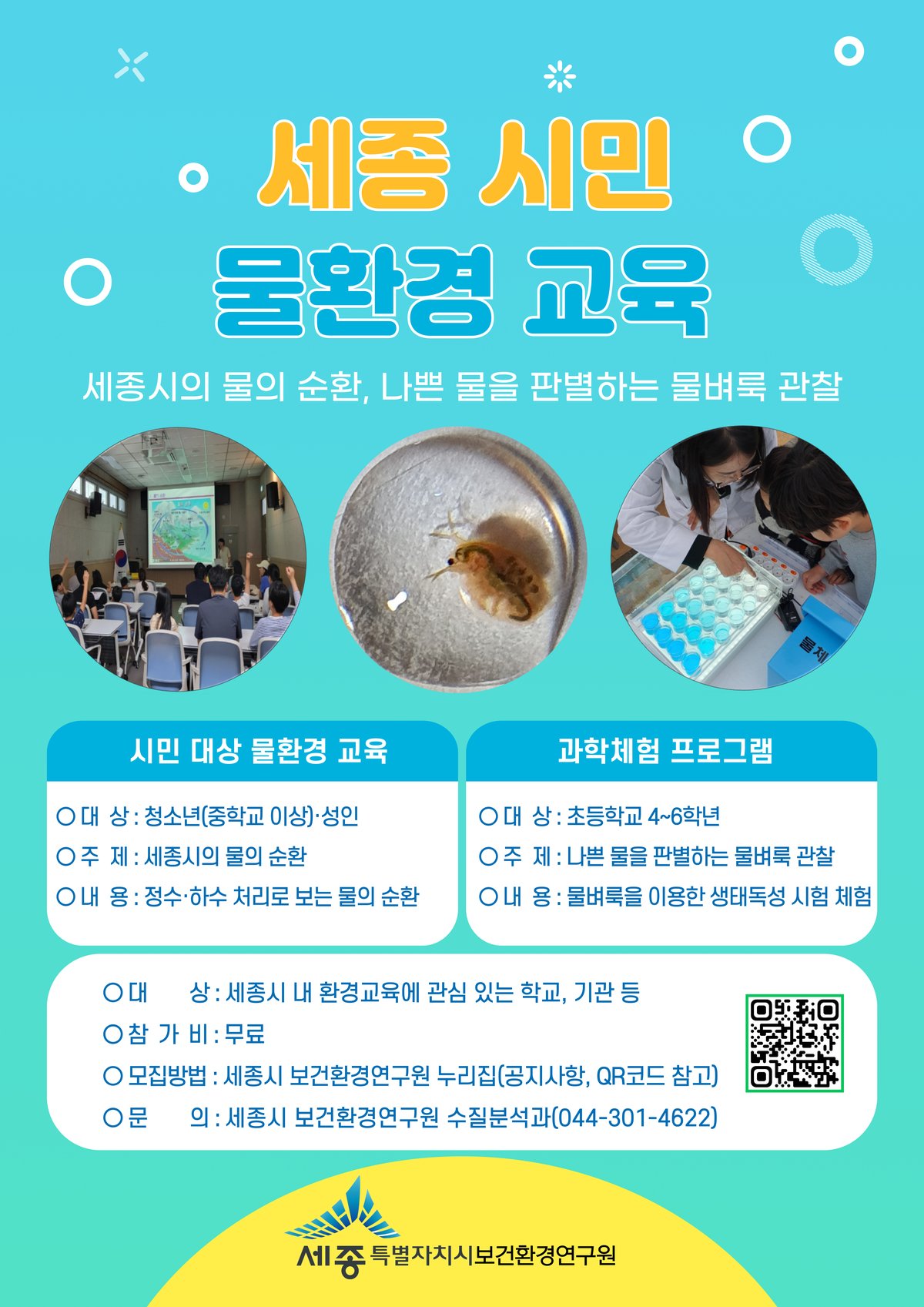교육은 세종시의 물의 순환 나쁜 물을 판별하는 물벼룩 관찰 교실 등 두 가지 프로그램으로 운영된다.