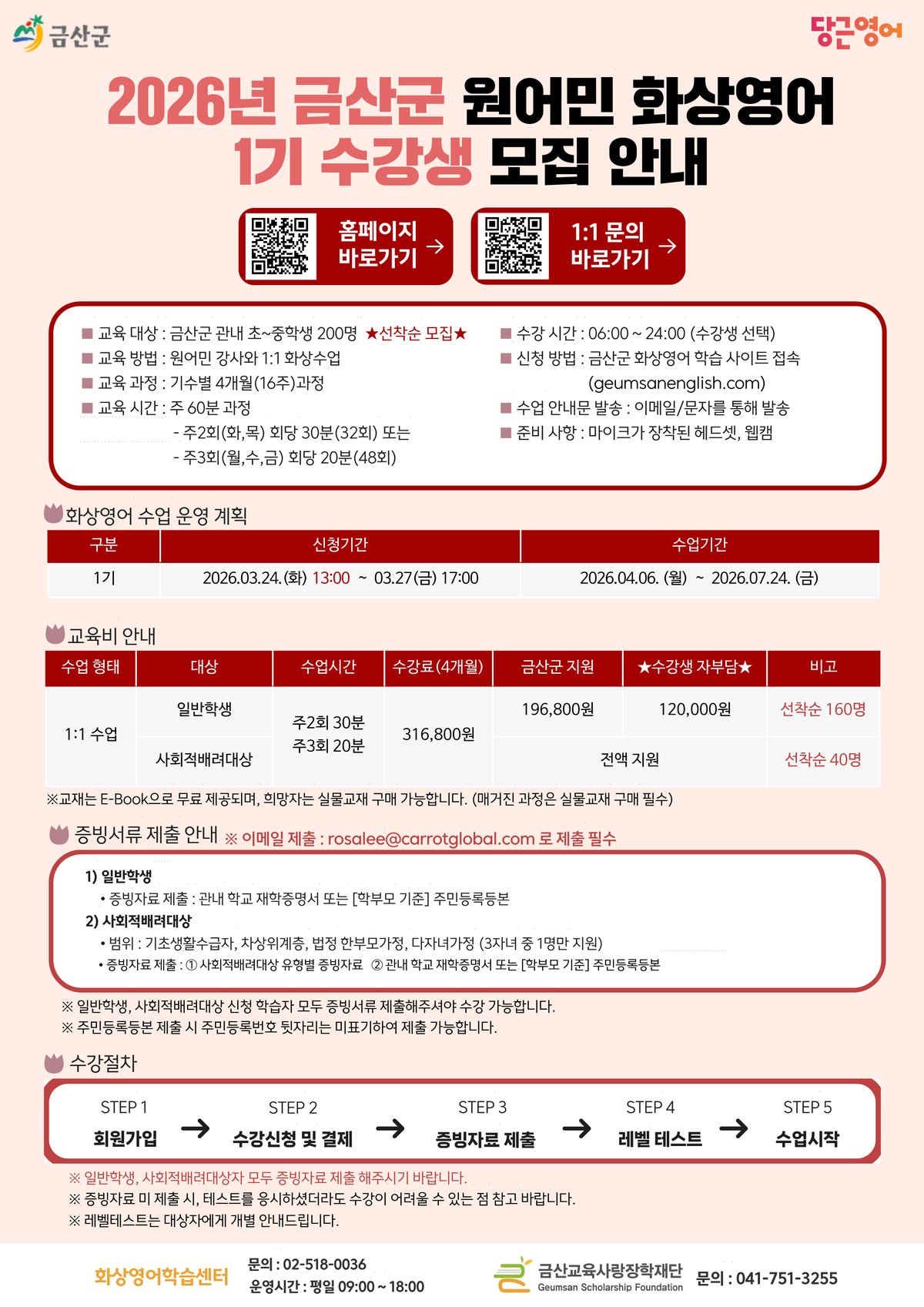 [충청중심뉴스] 금산군은 글로벌 인재양성 및 영어사교육비 절감을 위해 3월 24일부터 27일까지 원어민 화상영어 교육 제1기 수강생 200명을 모집한다.