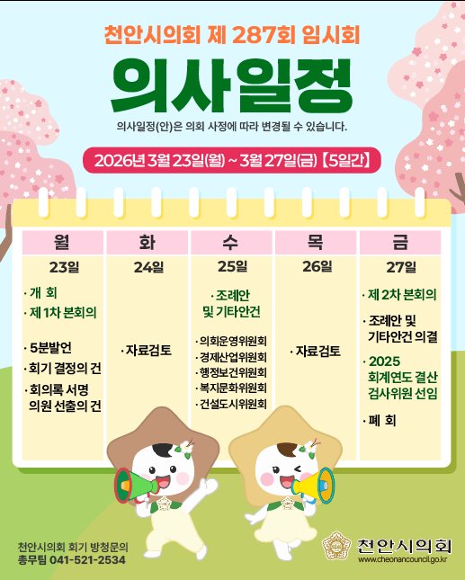 [충청중심뉴스] 천안시의회가 오는 3월 23일부터 27일까지 5일간의 일정으로 제287회 임시회를 운영한다.