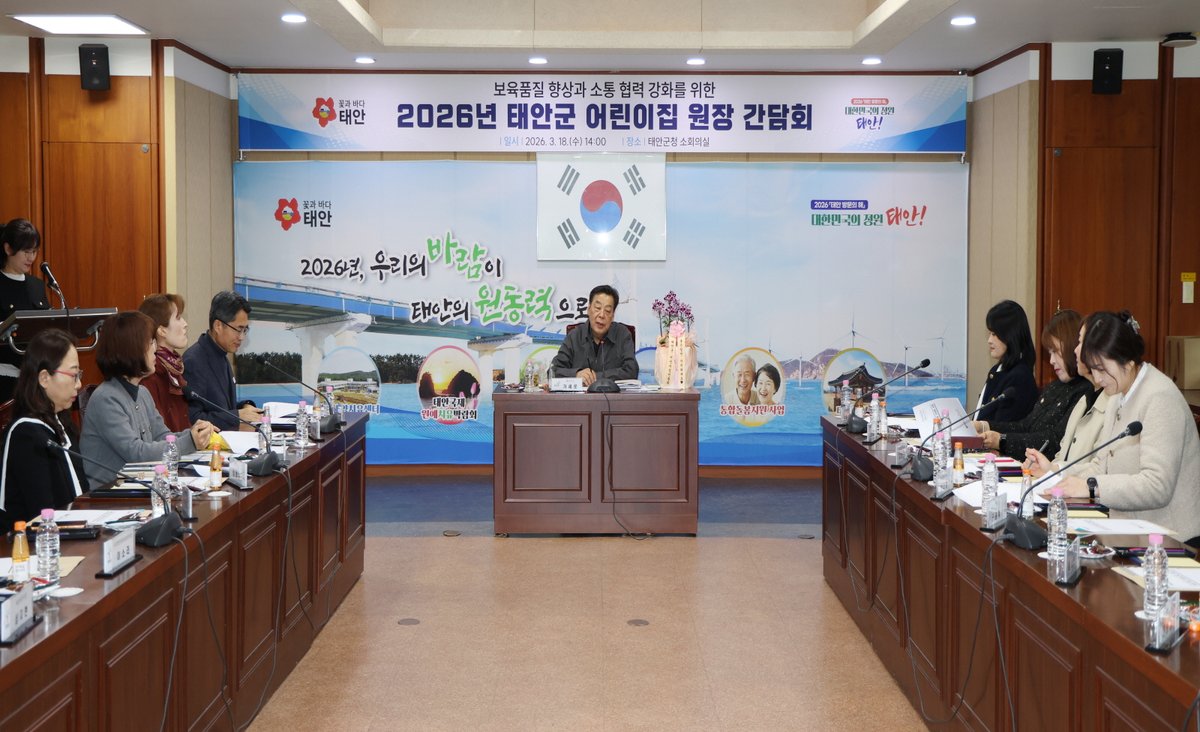 군은 지난 18일 군청 소회의실에서 가세로 군수 주재로 관내 19개소 어린이집 원장들과 함께 안전하고 쾌적한 보육환경을 조성하기 위한 ‘2026년 태안군 어린이집 원장 간담회’를 개최했다.