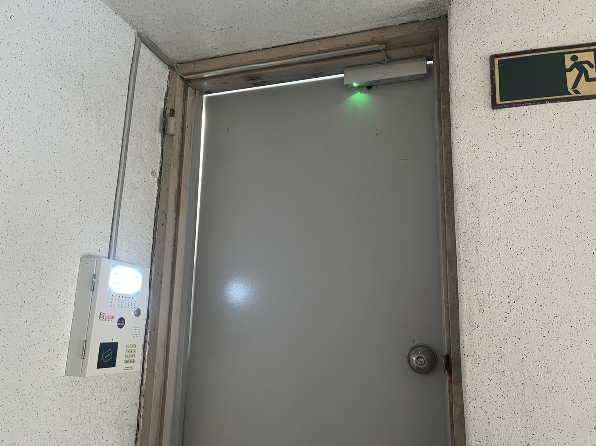 옥상출입문 자동개폐장치는 평상시에는 닫힌 상태로 방범 기능을 수행하고 화재 발생 시 감지기 신호를 받아 출입문이 자동으로 열려 주민들이 옥상으로 신속하게 대피할 수 있도록 돕는 장치다.