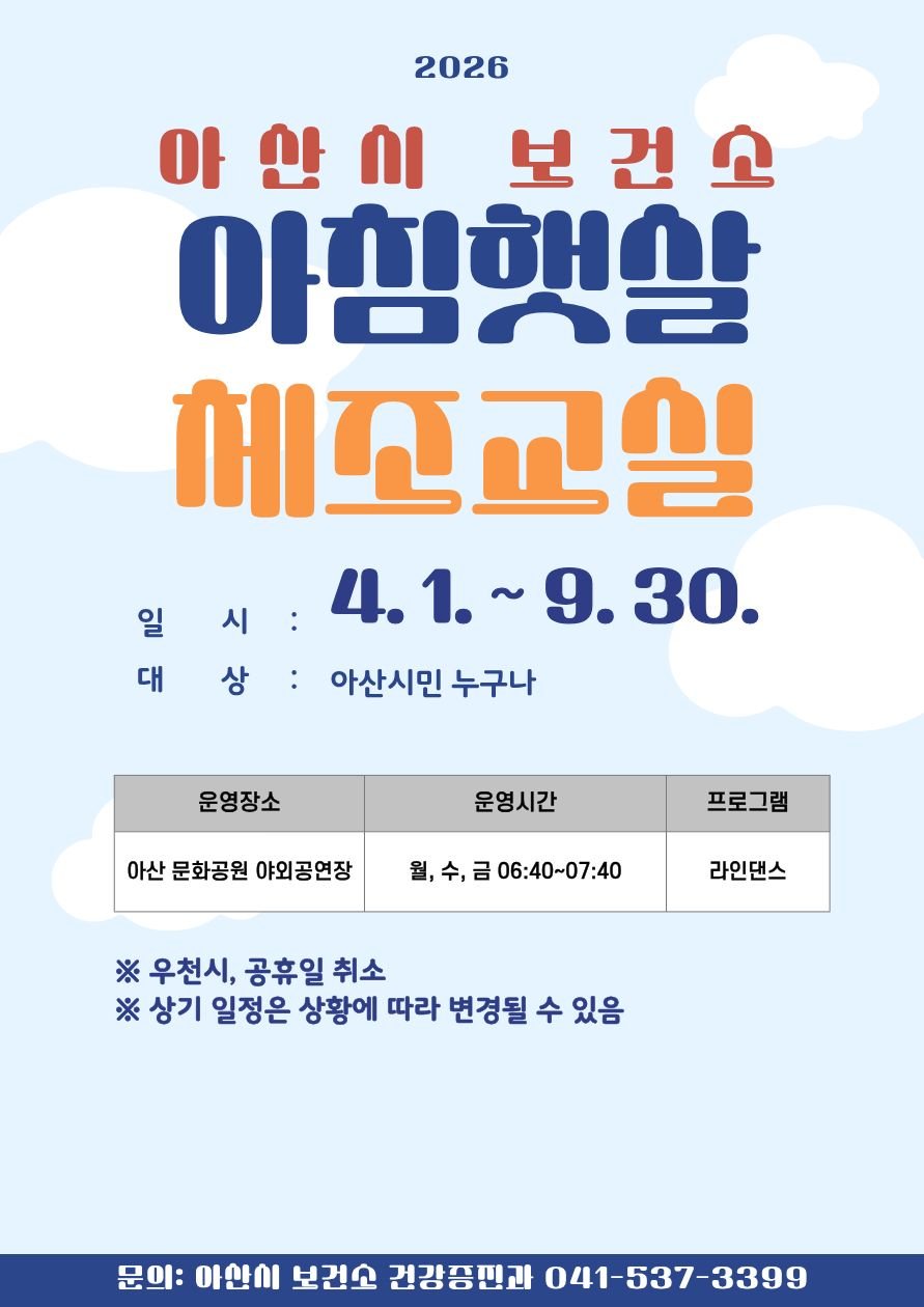 먼저, 매주 월 수 금 오전 6시 40분부터 7시 40분까지 아산문화공원 야외공연장에서 ‘아침햇살체조교실’을 운영한다.