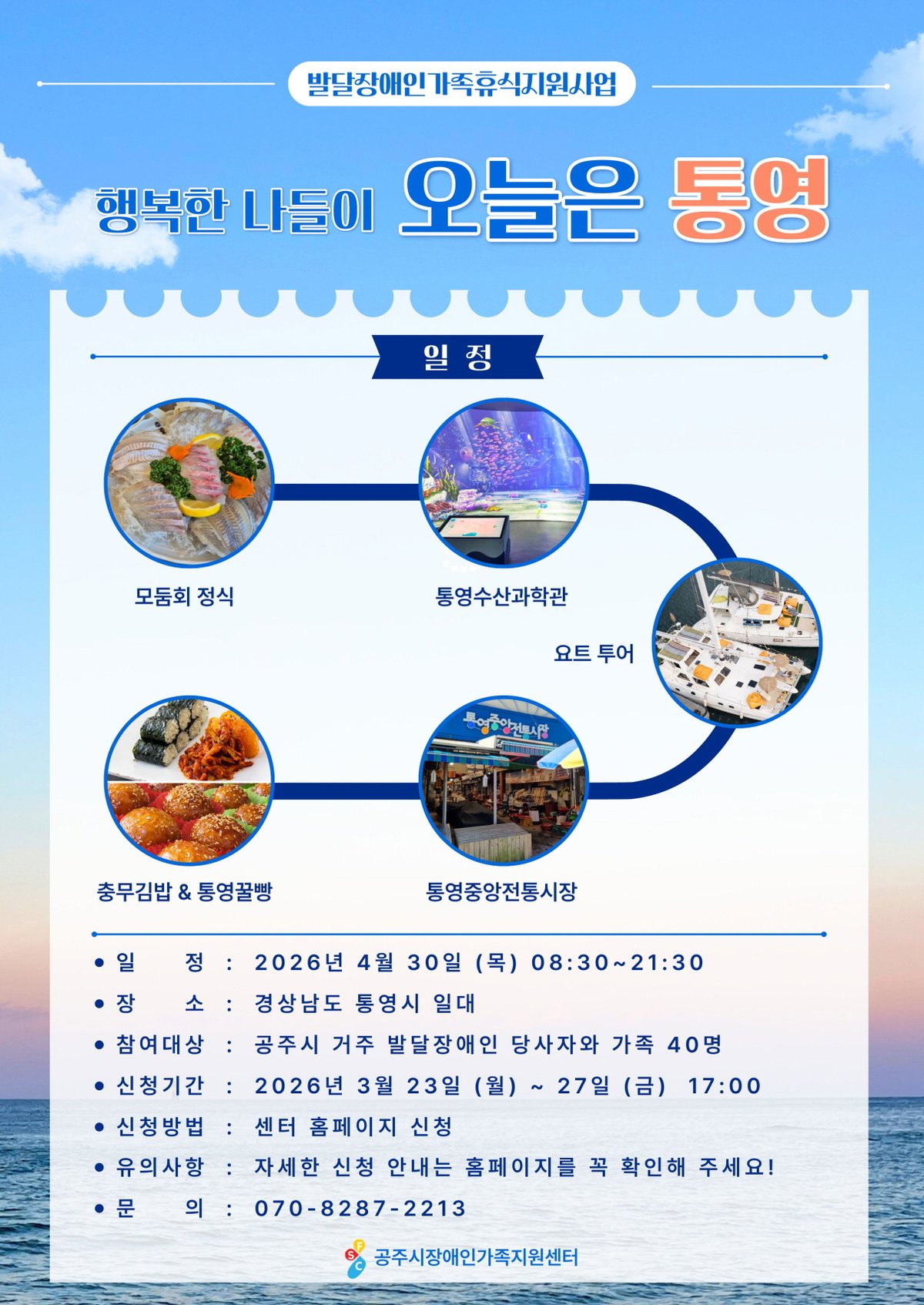 [충청중심뉴스] 공주시장애인가족지원센터는 공주시에 거주하는 발달장애인 가족을 대상으로 가족휴식지원사업 ‘행복한 나들이, 오늘은 통영’을 오는 4월 30일에 진행한다고 밝혔다.